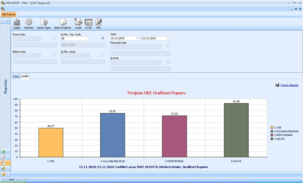 - Raporlara Zaman, İş Merkezi, personel, İş Kodu bazında filtre ve aralık uygulanabilir